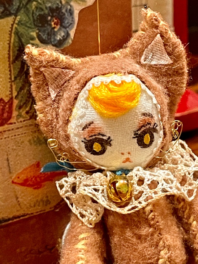 クルクルおひげのネコの子は キュッとおしっぽの長い 首元の小さな鈴が鳴る 金髪の子です まだまだ幼くて 悪戯なお顔立ち 身長9cm 金魚の小箱付き
