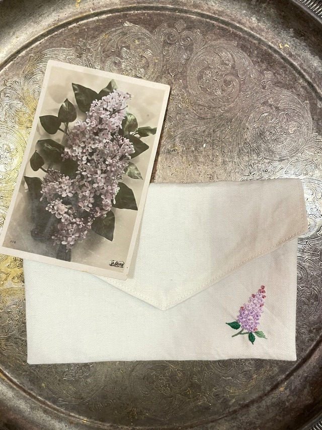 最果てアーケードオマージュ展 「紙店シスター」での出品です アンティークのライラックのカード 繊細なライラックの刺繍と 幸せの青い鳥 内側にも刺繍が隠れています 見えないところも美しい 洗うほどに風合いが出るので アクセサリーや メイク道具を入れて 持ち歩きたいサイズ感です 20×13cm