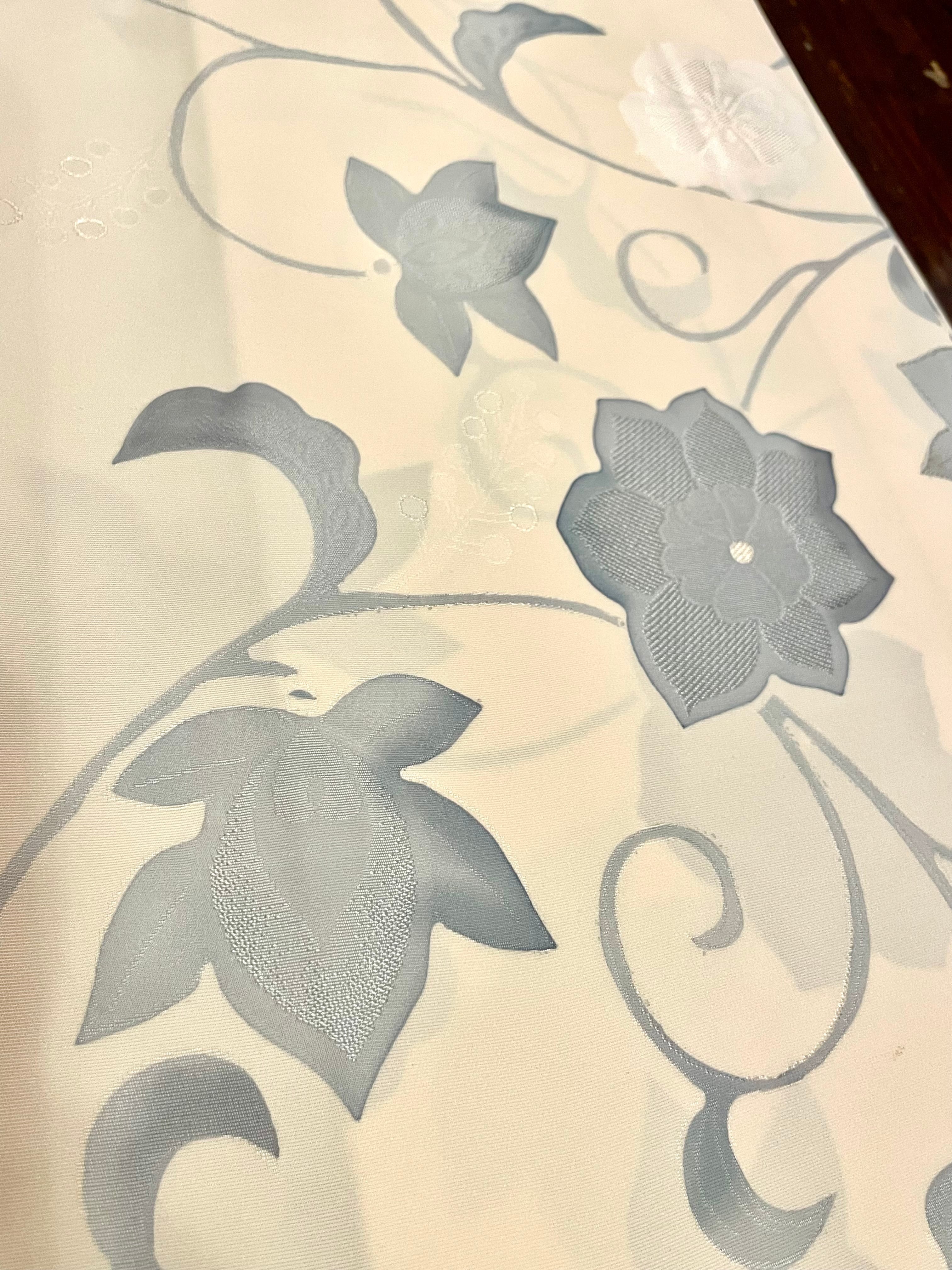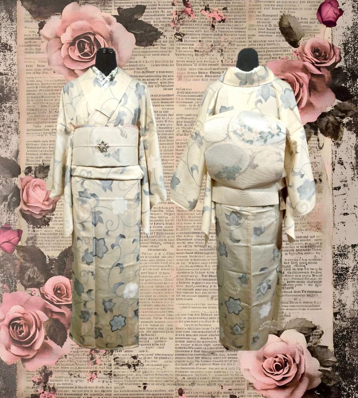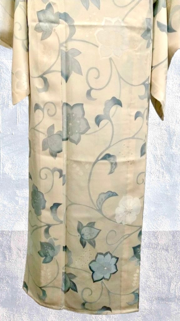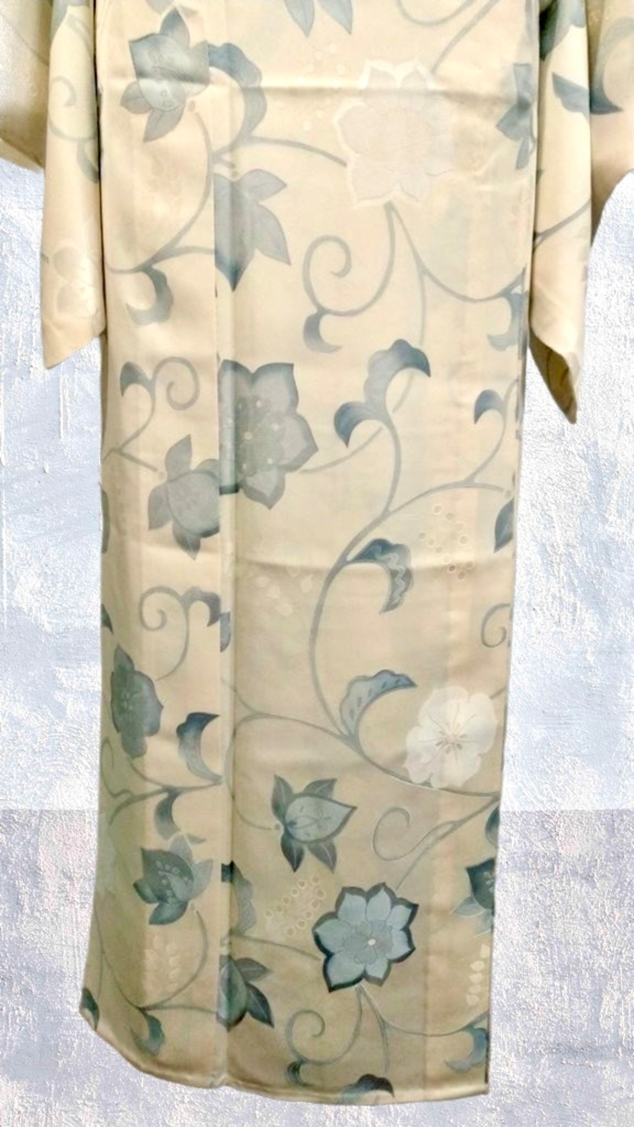 乳白色地に藍鼠の唐草模様が美しい小紋は袖丈長め