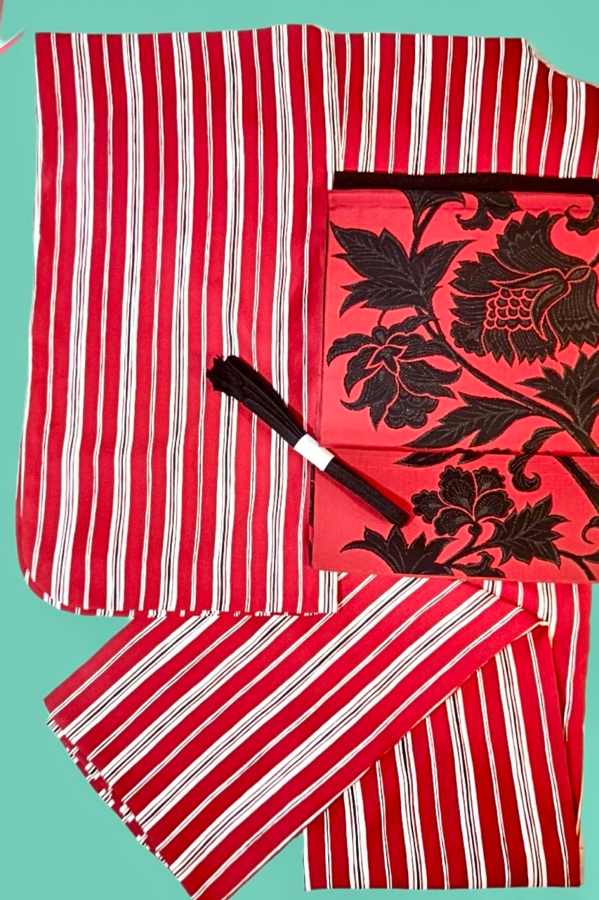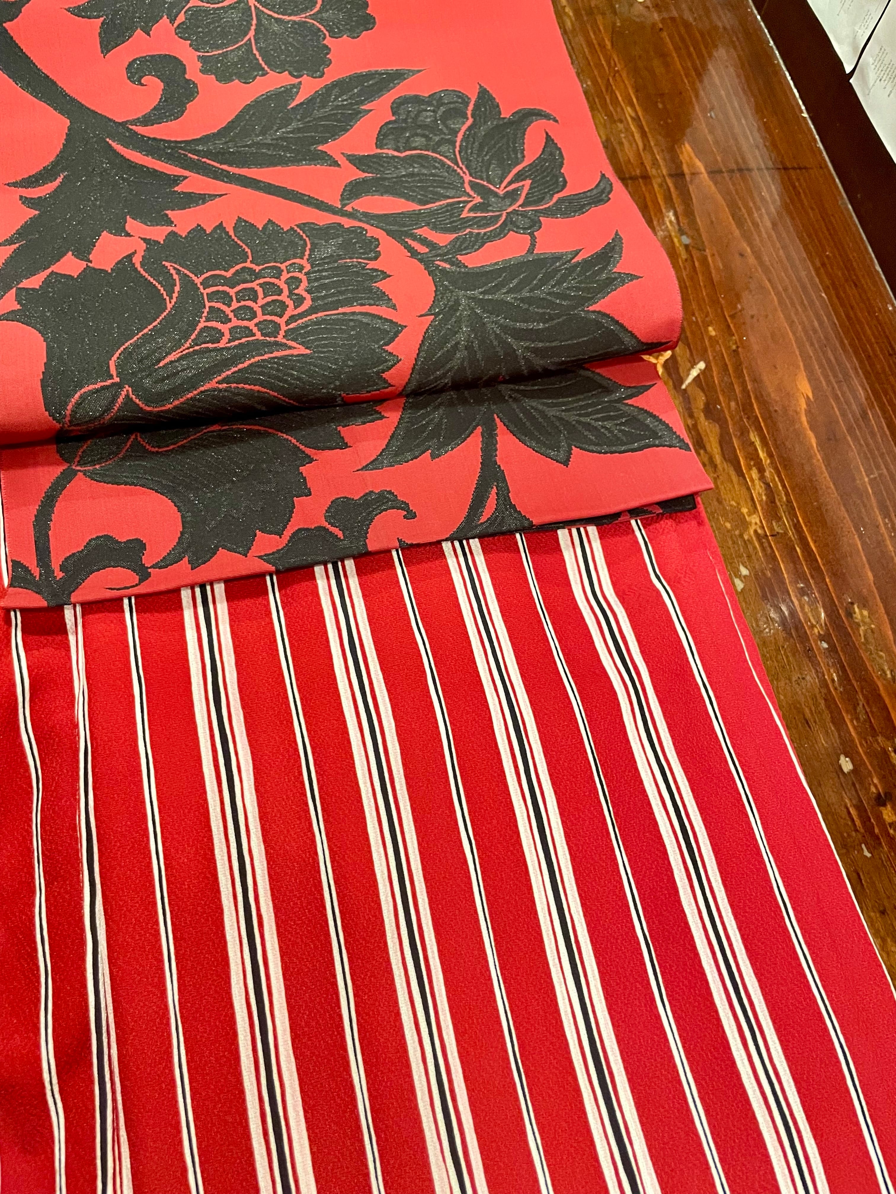 美しい赤の地にラメの入った黒の大胆な更紗模様の帯でカッコ可愛いコーデ