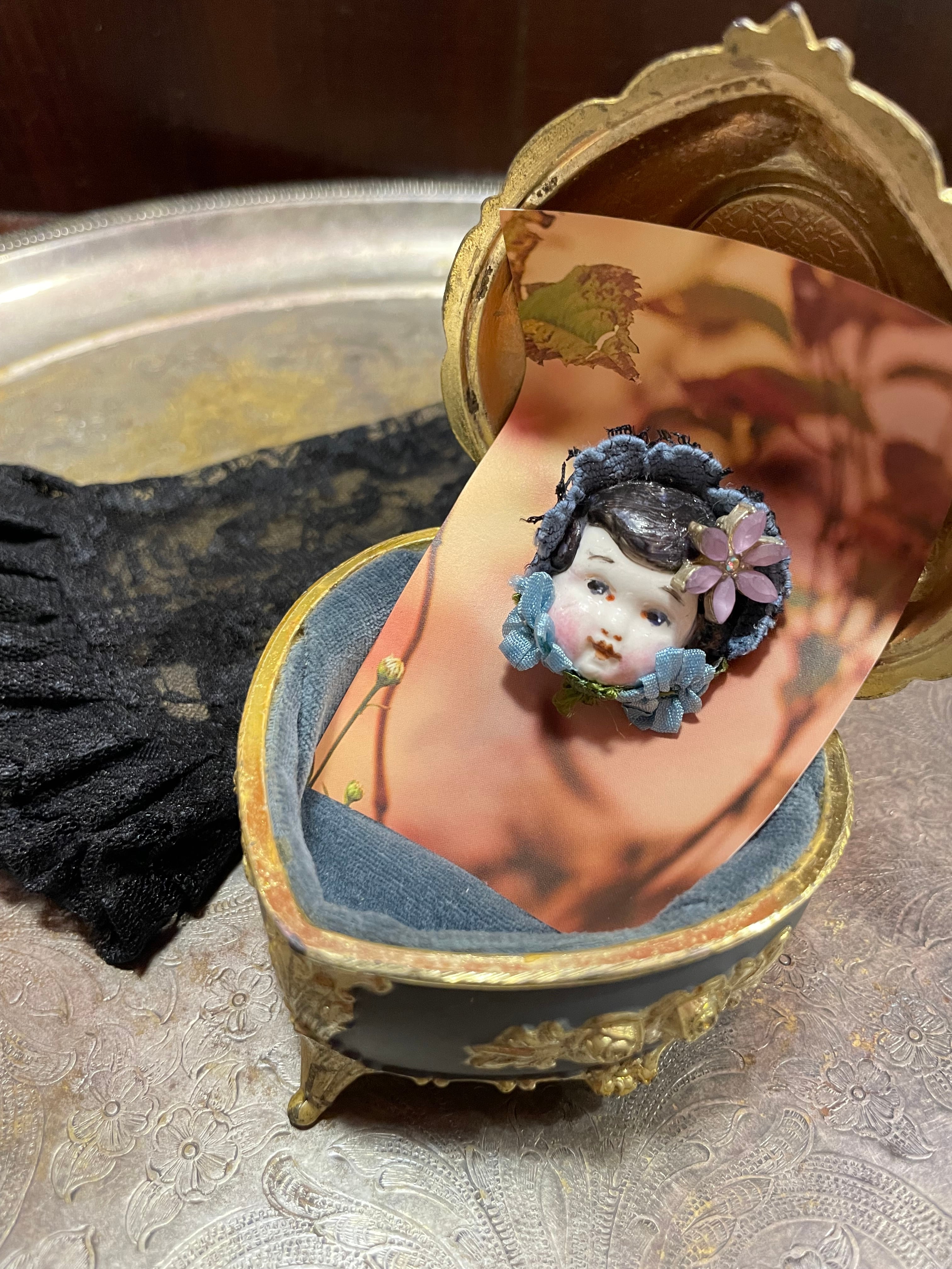 鷹塀三奈さんの 陶の女の子ブローチ ブルーのリボンの装いです 帯留にしても 襟元にもあいます 3.5×3cm