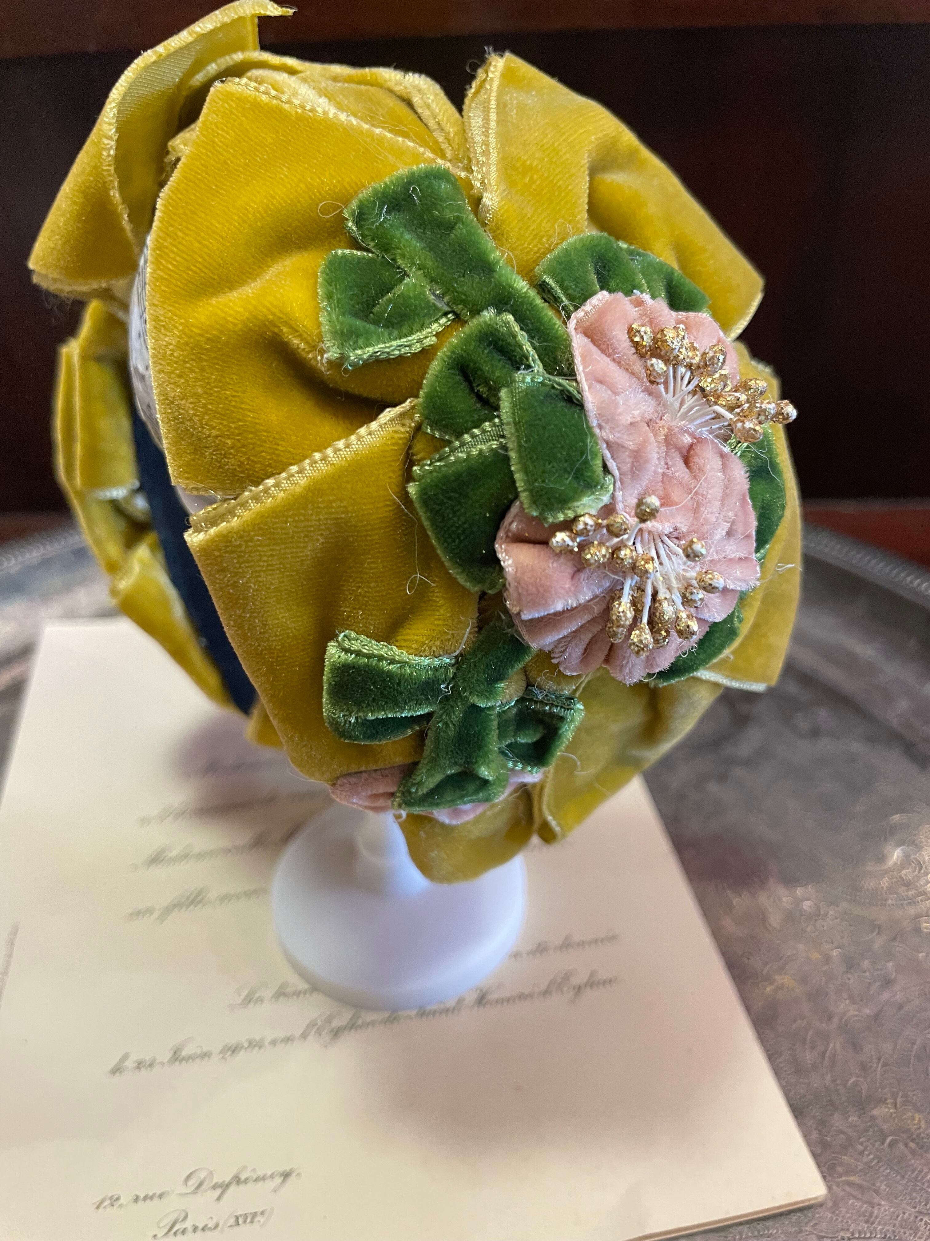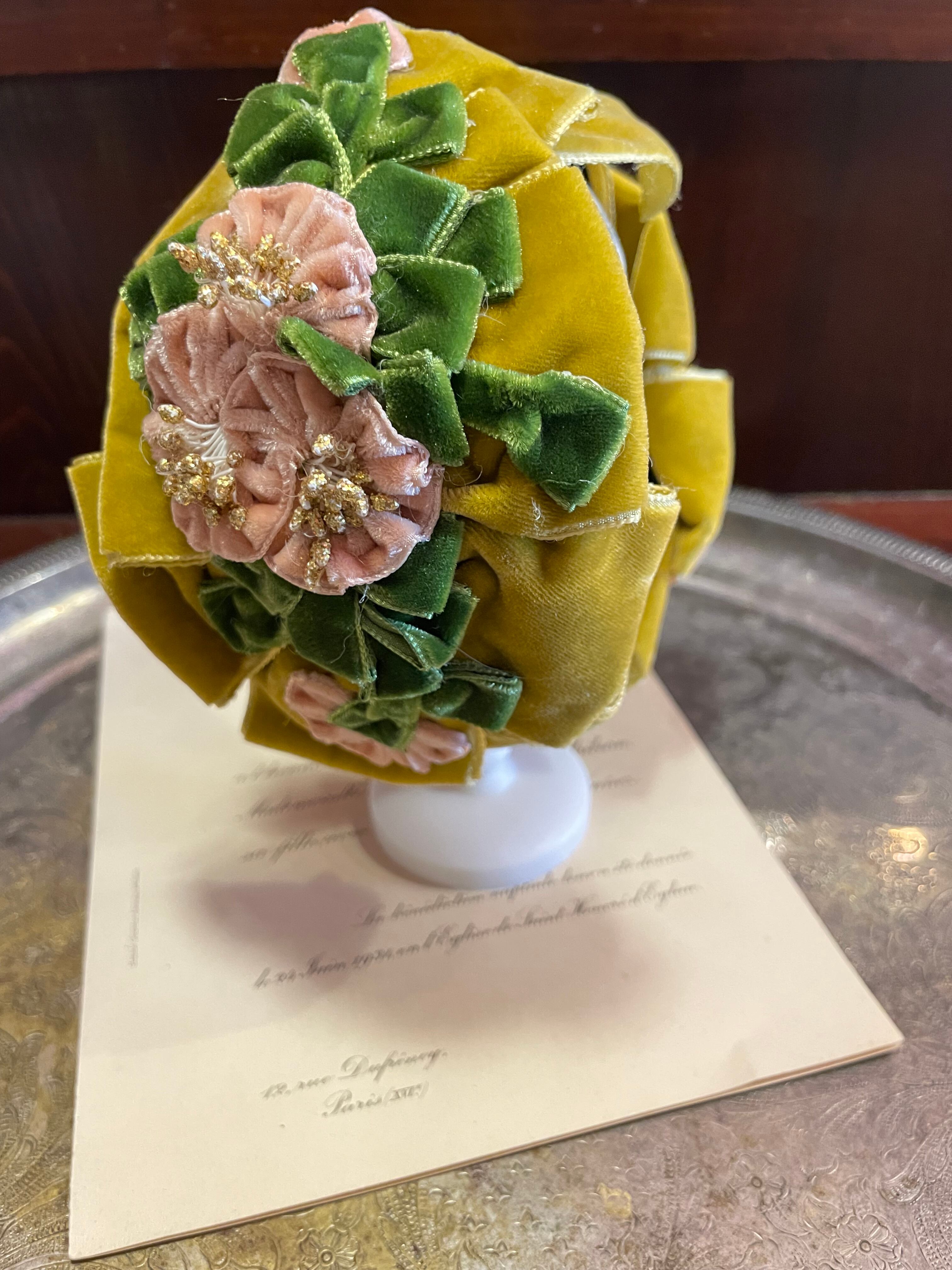 優雅なオークルカラーのベルベットヘッドドレスで、特別な瞬間を華やかに彩ります。
