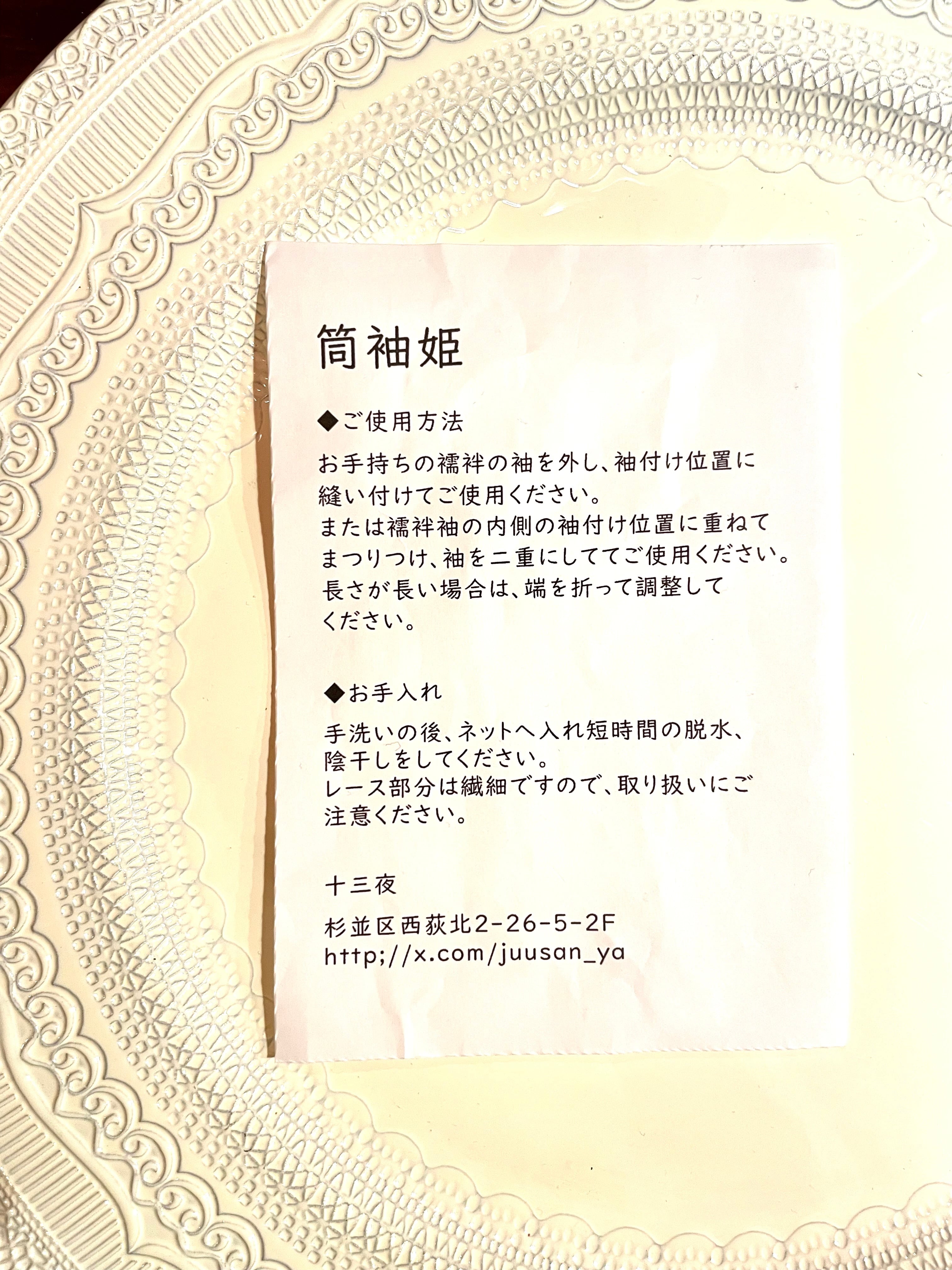 市販の筒袖よりも長く、華やかなレースを使用していますので、袖口ギリギリでも、少し出して裄の短い着物に合わせても♪