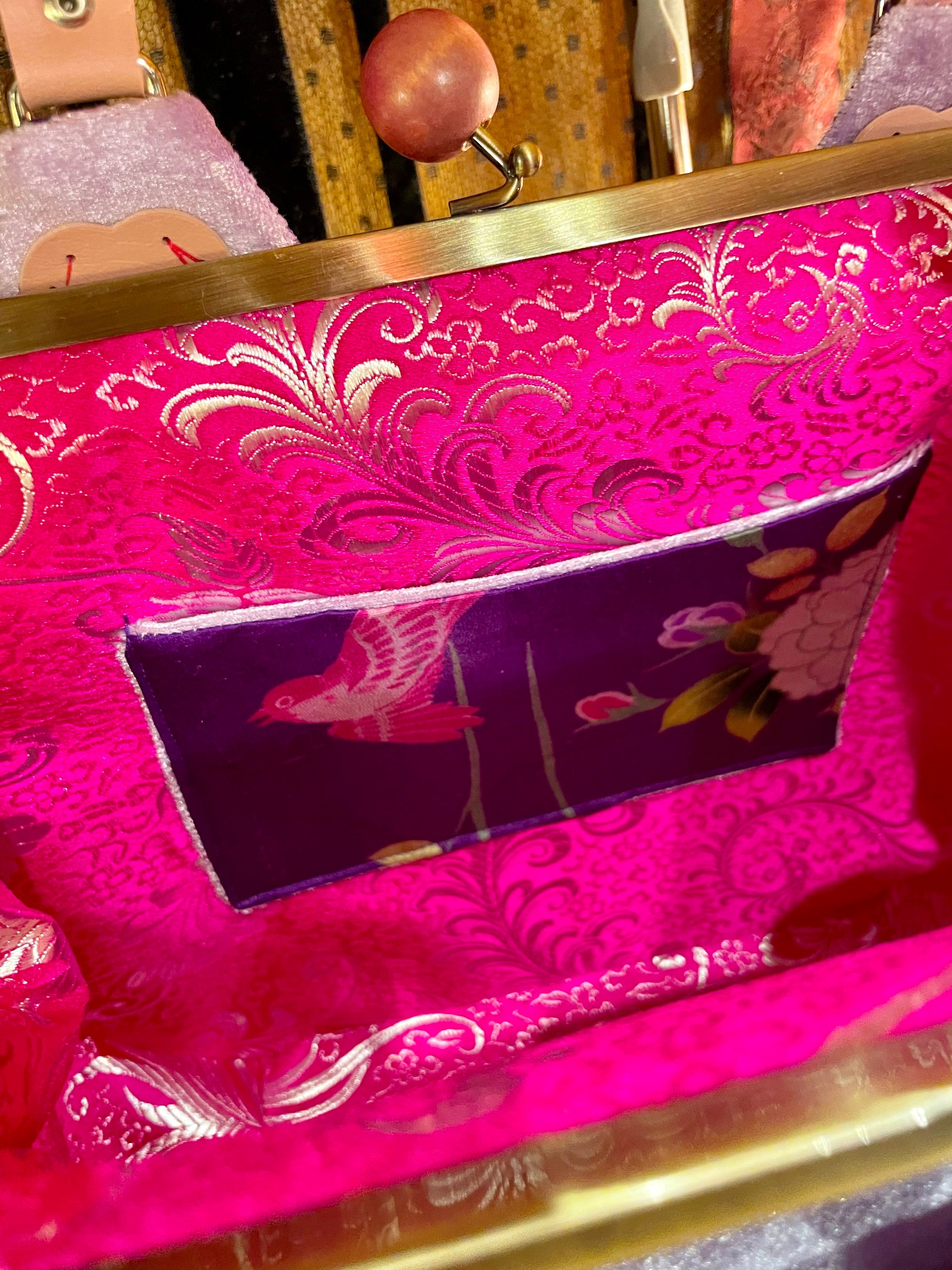 やわらかく香り立つような花々の中で、小鳥が遊ぶ愛らしい古布を、がま口バッグにお仕立て致しました。外側には優しい藤色の別珍を。内布には古布の鳥をイメージした羽柄のチャイナ地を合わせました