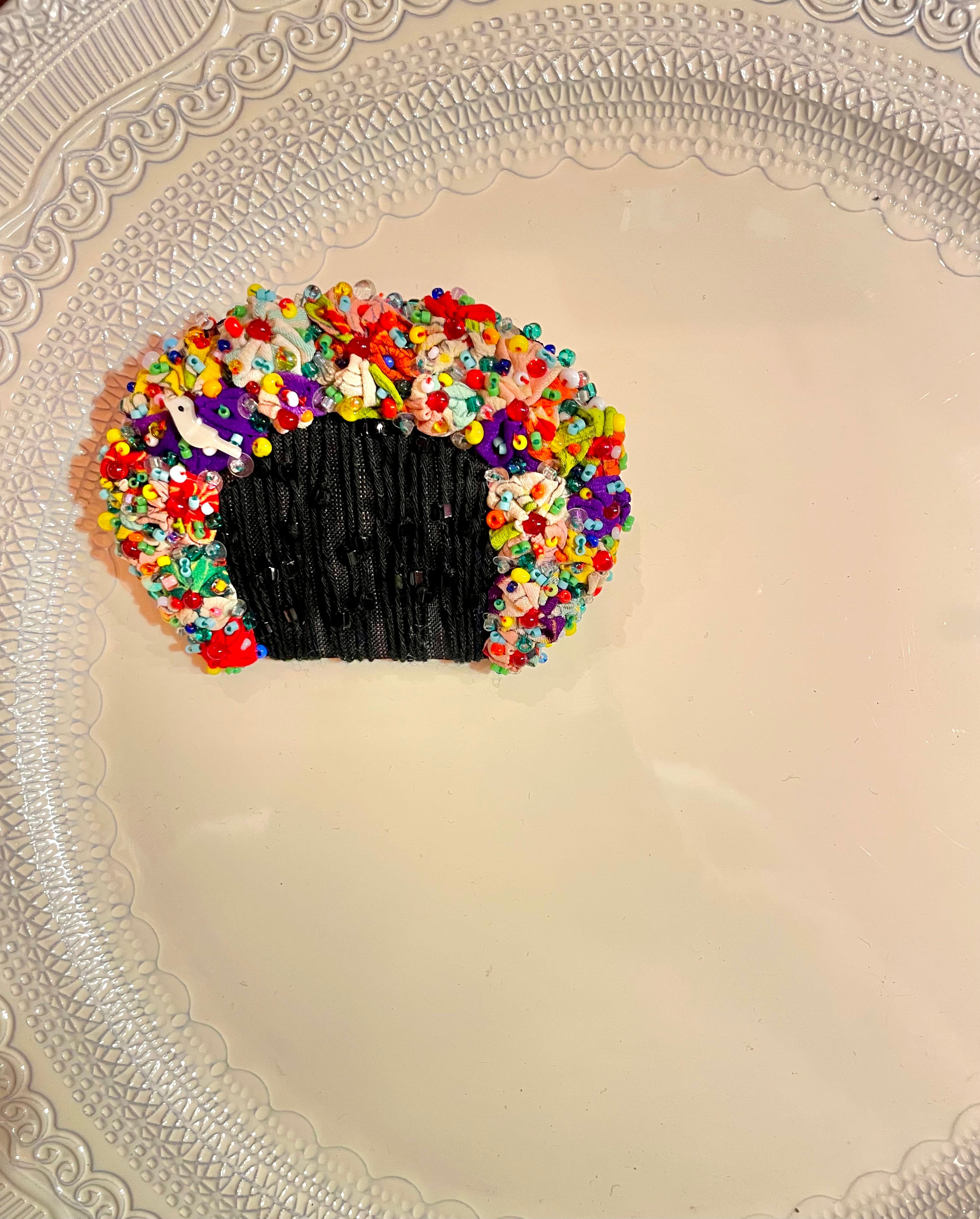 貝パーツの鳥さんがちょこんと乗っています。